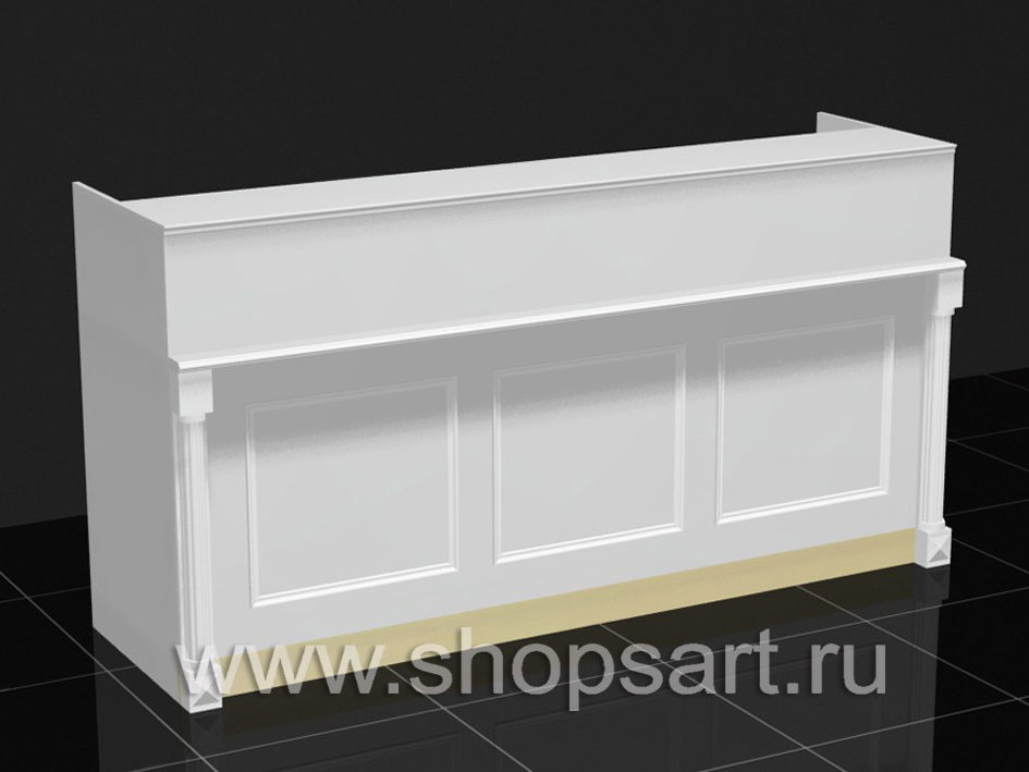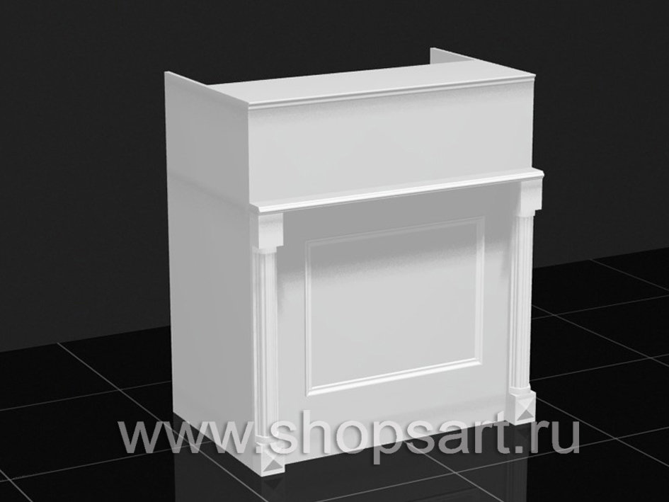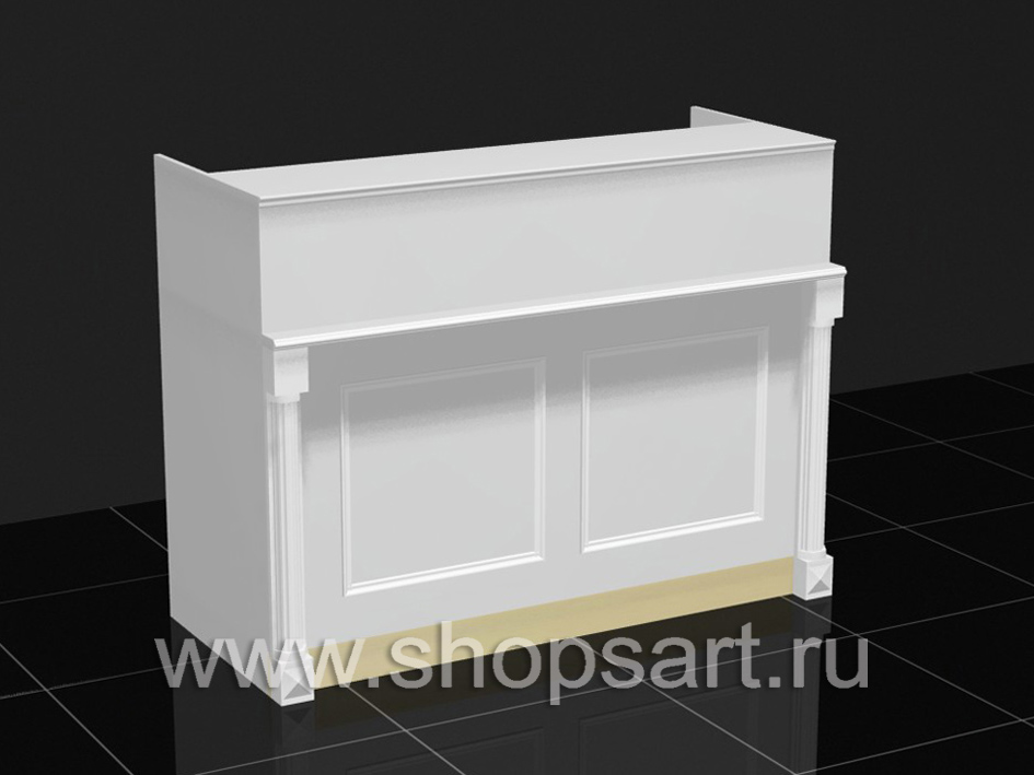 08. Кассовый стол, из ЛДСП белого цвета, с декоративными элементами из массива дуба, окрашенного в белый цвет.