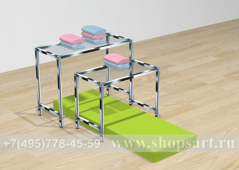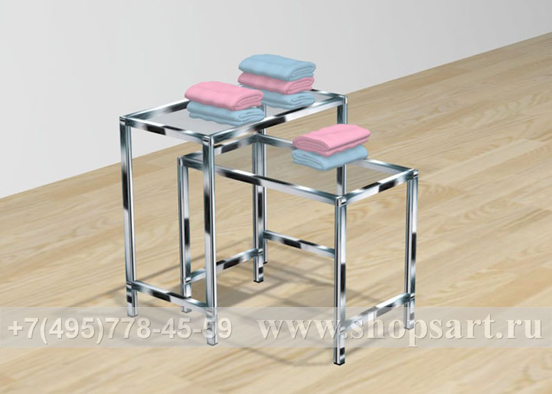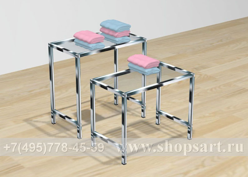 Островная конструкция производится из ЛДСП, стекла 8мм. и металлической трубы 20х20мм. Благодаря оригинальному дизайну, гармонично сочетающему хромированный металл, стекло и цветовому решению стола и подиума, остров привлекает внимание покупателей. Островная конструкция удобна для выкладки и просмотра одежды, обуви, аксессуаров. Используется для выкладки товара в центре зала и оформления витрин.