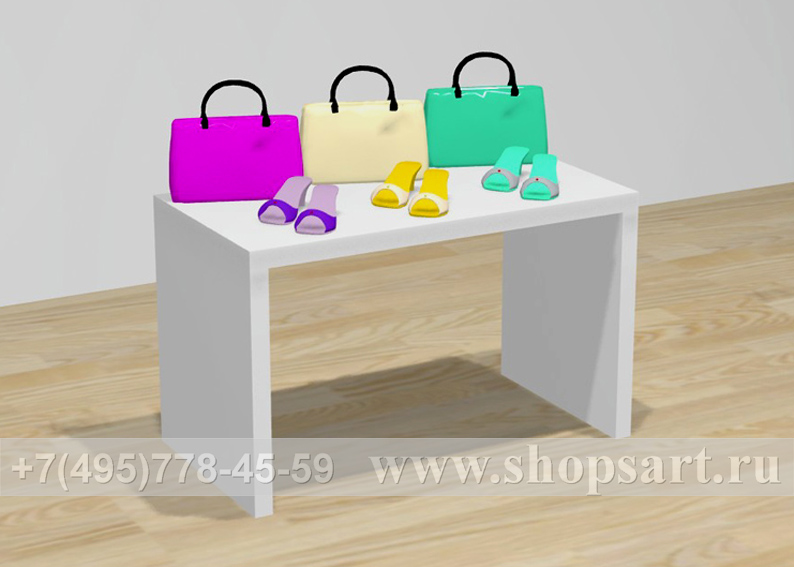 Островной стол производится из ЛДСП. Стол удобен для выкладки и просмотра одежды, обуви, аксессуаров. Используется для выкладки товара в центре зала и оформления витрин.