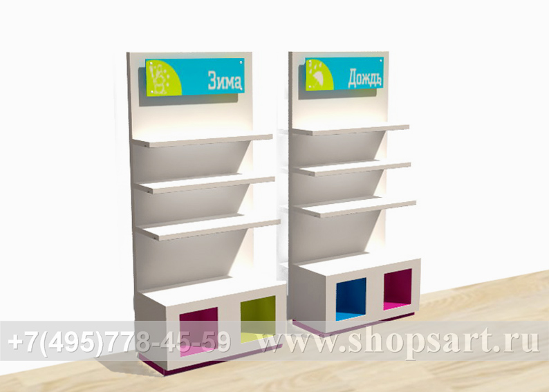 Пристенные стеллажи с информационными табличками позволят не потеряться в огромном ассортименте обувных магазинов. Нижние тумбы с цветными кубиками с подсветкой создают атмосферу детских пирамидок. Стеллажи с полками изготавливаются в белых цветах, чтобы не мешать демонстрации яркой детской обуви. Стеллажи могут изготавливаться со стационарными полками, имеющими светодиодную подсветку. Так же в этой коллекции присутствуют стеллажи на базе тонких перфорированных стоек позволяющих перемещать полки на разную высоту в зависимости от ассортимента.