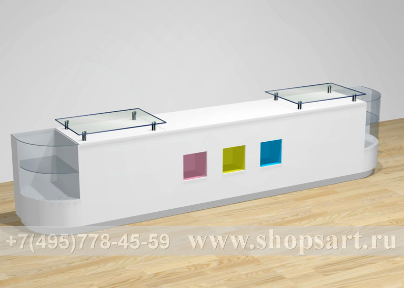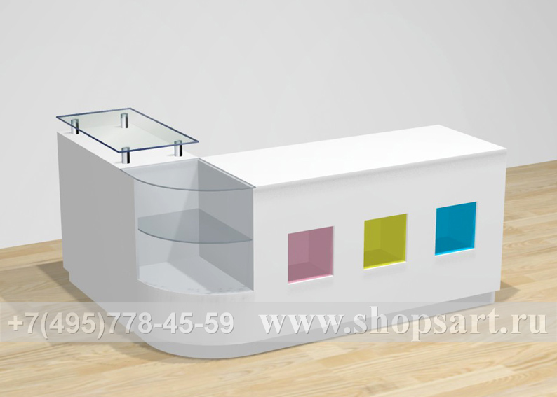 Стол производится из ЛДСП, стекла 8 мм. Ниши в столе могут быть с подсветкой и служить элементом декорирования кассового стола. Радиусные витрины могут использоваться как для выкладки товара, так и для декорирования кассового стола.