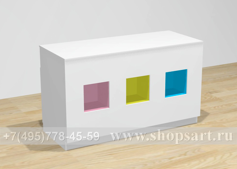 Стол производится из ЛДСП. Ниши в столе могут быть с подсветкой и служить элементом декорирования кассового стола.