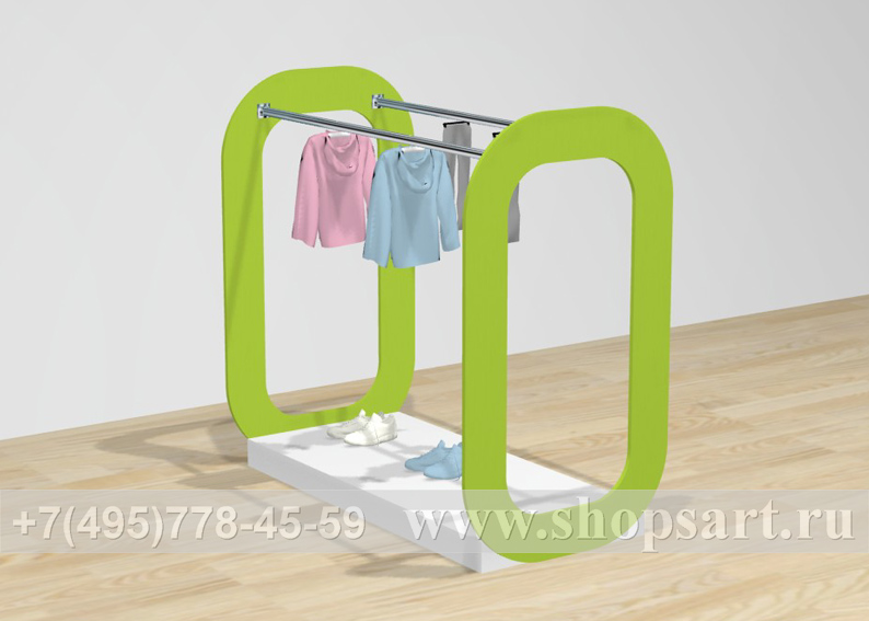 Стойка имеет две штанги для большего количества вывешиваемой одежды. На боковые стенки могут наноситься картинки с изображением бренда вывешенного товара. Стойка производится из ЛДСП, металлической трубы d 25 мм. Может размещаться в центре торгового зала. Стойка привлекает внимание покупателей своим оригинальным дизайном, удобна для навески одежды.
