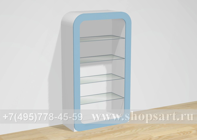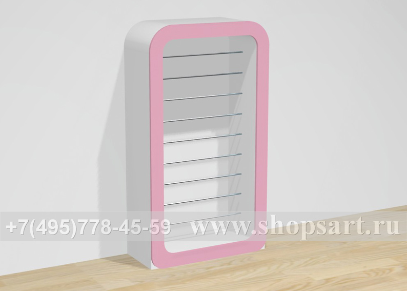 Стеллаж производится из ЛДСП, стекла 8мм. Стеллаж имеет округлые формы и привлекает внимание покупателей своим оригинальным дизайном, удобен для выкладки обуви.