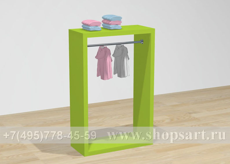 Стойка имеет верхнюю полку для выкладки одежды и аксессуаров. На боковые стенки могут наноситься картинки с изображением бренда вывешенного товара. Стойка производится из ЛДСП, металлической трубы d 25 мм. Может размещаться в центре торгового зала. Стойка привлекает внимание покупателей своим оригинальным дизайном, удобна для навески и выкладки одежды.