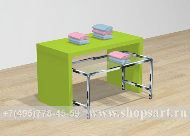 Островные столики производятся из ЛДСП. Столики удобны для выкладки и просмотра одежды, обуви, аксессуаров. Используются для выкладки товара в центре зала и оформлении витрин.
