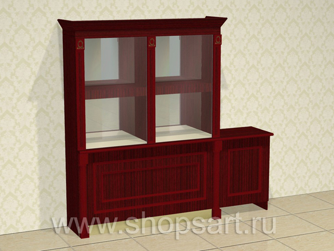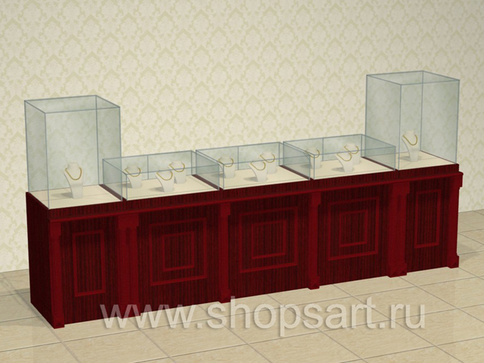 Линия ювелирных прилавков в сочетании с высокими кубами, изготавливаются из ЛДСП, с декоративными элементами из массива дуба. Стеклянный колпак из стекла 8мм., склейка УФ, дверки распашные. Золотая фурнитура (замки и петли). Высота 1100мм., ширина 800мм., глубина 582мм., козырек 70мм. На все прилавки устанавливается мастер ключ. Ножки регулируемые. Цоколь — металлизированный пластик.