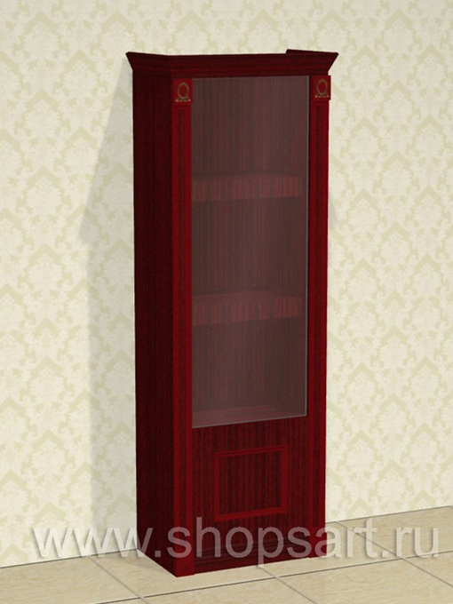 Шкаф для показа ювелирных украшений. Изготавливается из ЛДСП. Под полками устанавливается светодиодная подсветка, дверки стеклянные, распашные. Золотая фурнитура (замки и петли). Высота 2114мм., ширина 590мм., глубина 300мм. Ножки регулируемые. Цоколь из массива дерева. В верхней части витрины устанавливается декоративный карниз.