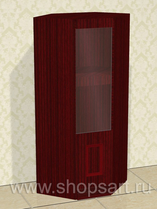 Витрина угловая — трапеция, изготавливается из ЛДСП. Дверки стеклянные, распашные. Золотая фурнитура (замки и петли). Высота 1600мм., ширина 590мм., глубина 300мм. Ножки регулируемые. Цоколь махагон.