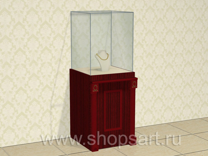 Куб в линии прилавков или кассы. Стеклянный колпак из стекла 8мм., склейка УФ, дверки распашные, золотая фурнитура (замки и петли). Куб крайний с колоннами. Ножки регулируемые. Цоколь ЛДСП., высота 1620мм., ширина 582мм, глубина 582мм.