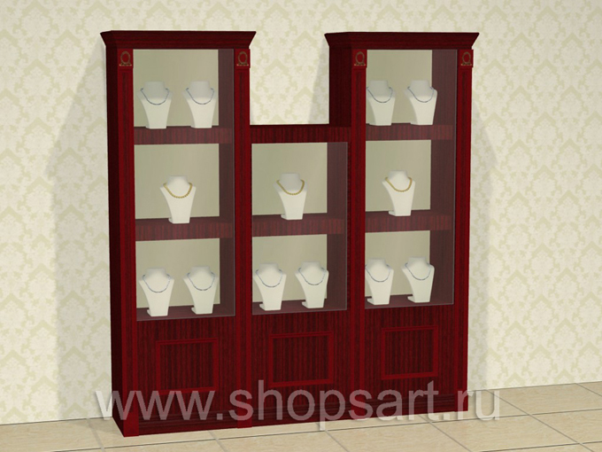 Шкафы для демонстрации ювелирных украшений, изготавливается из ЛДСП. Под полками устанавливается светодиодная подсветка, дверки, стеклянные распашные. Золотая фурнитура (замки и петли). Высота 2114мм. и 1600мм., ширина 590мм., глубина 300мм. Ножки регулируемые. Цоколь — массив дерева. В верхней части витрины устанавливается декоративный карниз.