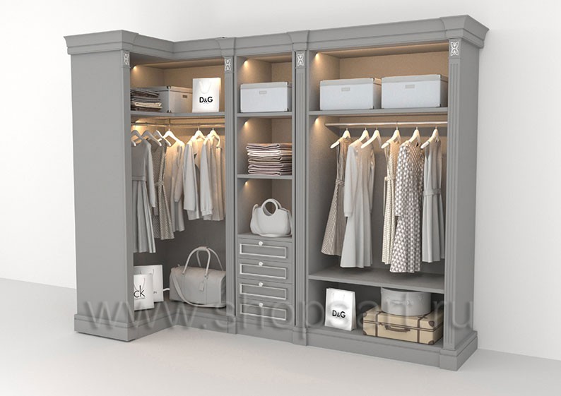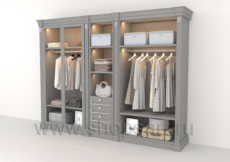 Гардеробные комнаты стали неотъемлемой частью любого домашнего интерьера, позволяют сэкономить свободное пространство и компактно разместить повседневные вещи или одежду. Коллекция мебели для гардеробных КЛАССИЧЕСКИЙ СТИЛЬ просчитана до мелочей и все вещи будут размещены так, чтобы получить к ним быстрый и удобный доступ. В качестве наполнения мебели для гардеробных комнат, используются различные шкафы, укомплектованные необходимыми кронштейнами, полками, выдвижными ящиками и другими системами хранения, что создаст порядок и комфорт в доме. Шкафы для хранения одежды можно легко установить, они не потребуют какого-то специального ухода. Оборудование для гардеробных комнат, позволяет получить стильное, изысканное пространство, учитывая, все архитектурные аспекты помещения и позволяет укомплектовать мебелью, как большие, так и маленькие комнаты различной конфигурации. Мебель для гардеробной комнаты представлена в классическом стиле, каркас и декоративные элементы выполнены в популярном и модном на сегодня сером цвете. Такая цветовая гамма мебели смотрится стильно и элегантно и никогда не наскучит. Шкафы для одежды и шкафы для обуви позволят оформить помещения, как в небольших квартирах, так и в больших домах, поможет разместить очень много вещей и создать комфорт и уют в вашем доме.