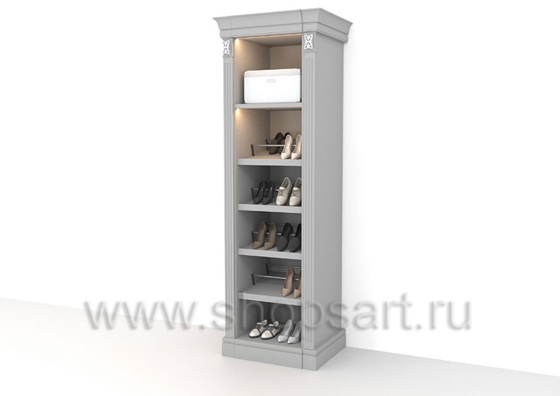 Открытый шкаф предназначен для оформления гардеробных комнат. Внутренне наполнение шкафа состоит из секции с наклонными полками для хранения обуви. Каркас выполнен из матового ЛДСП, цвет светло серый, колонны и карниз выполнены из массива дуба. По желанию заказчика шкаф может быть выполнен в другом цвете материалов.