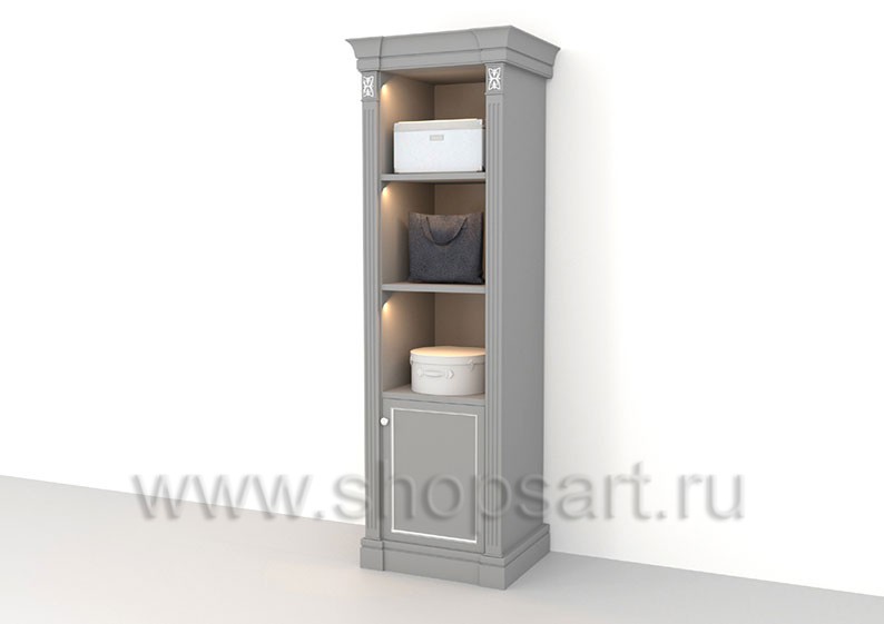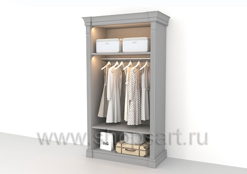 Шкаф для одежды имеет открытую конструкцию, оснащен верхней и нижней полками для хранения вещей. Для хранения одежды на плечиках установлена штанга. Изделие выполнено из матового ЛДСП светло-серого цвета. Шкаф для одежды оформлен в классическом стиле, имеет внутреннюю подсветку. Декоративная отделка колонны, карниз и цоколь изделия выполнены из массива дуба. Шкаф может быть выполнен в другом цвете материалов.