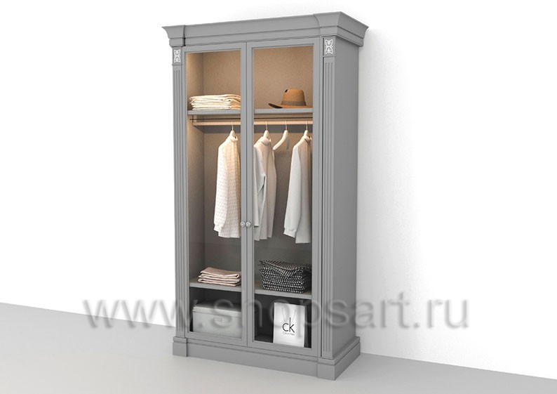Гардеробный шкаф для хранения одежды представлен в классическом стиле, состоит из двух модулей. Первый модуль состоит из открытой секции с полками для хранения одежды. Второй модуль состоит из шкафа для одежды с распашными стеклянными дверками, оснащен штангой для хранения одежды на плечиках и полками для выкладки одежды или любых, других вещей. Изделие выполнено из матового ЛДСП, цвет светло серый с декоративной отделкой из массива дуба.