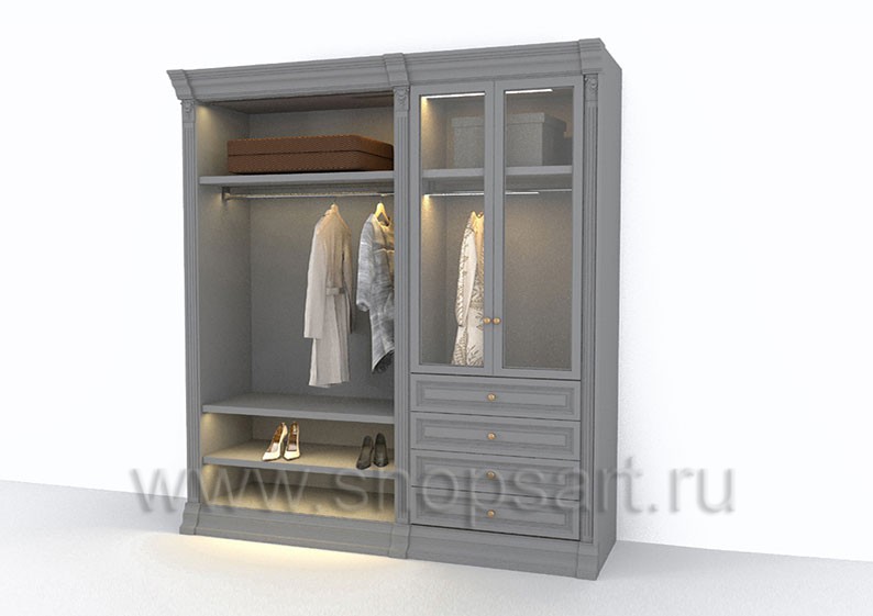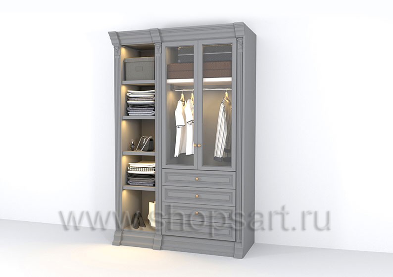 Мебель для гардеробной комнаты в виде двухсекционного шкафа для одежды и личных вещей оформлена в классическом стиле. Первая секция шкафа состоит из открытой пристенной конструкции с полками для хранения одежды, оснащена тумбой с выдвижными ящиками для хранения личных вещей. Вторая секция изделия состоит из шкафа для одежды с распашными стеклянными дверками, оснащена навесной штангой для одежды и полочками для выкладки вещей.