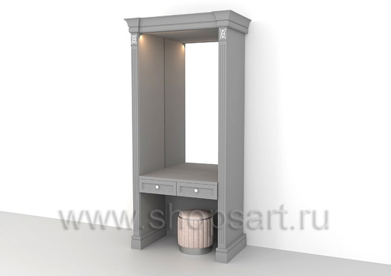 Открытый гарнитур с туалетным столиком предназначен для размещения косметики или аксессуаров. В нише установлено зеркало, в котором можно любоваться своим отражением собираясь на прогулку или работу. Для удобного размещения перед туалетным столиком предусмотрено место для банкетки или пуфика. Конструкция гарнитура оформлена в классическом стиле. Гарнитур может быть выполнен в другом цвете материалов.