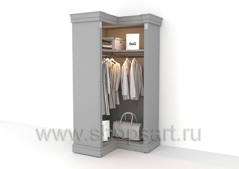 Шкаф угловой имеет открытую конструкцию, предназначен для оформления композиций в гардеробной комнате. Для хранения вещей шкаф оснащен полкой, а для сортировки и хранения одежды на плечиках установлена штанга. Шкаф в классическом стиле, выполнен из матового ЛДСП, цвет светло-серый. Декоративная отделка колонны, карниз и цоколь изделия выполнена из массива дуба. Изделие может быть выполнено в другом цвете материалов по желанию заказчика.