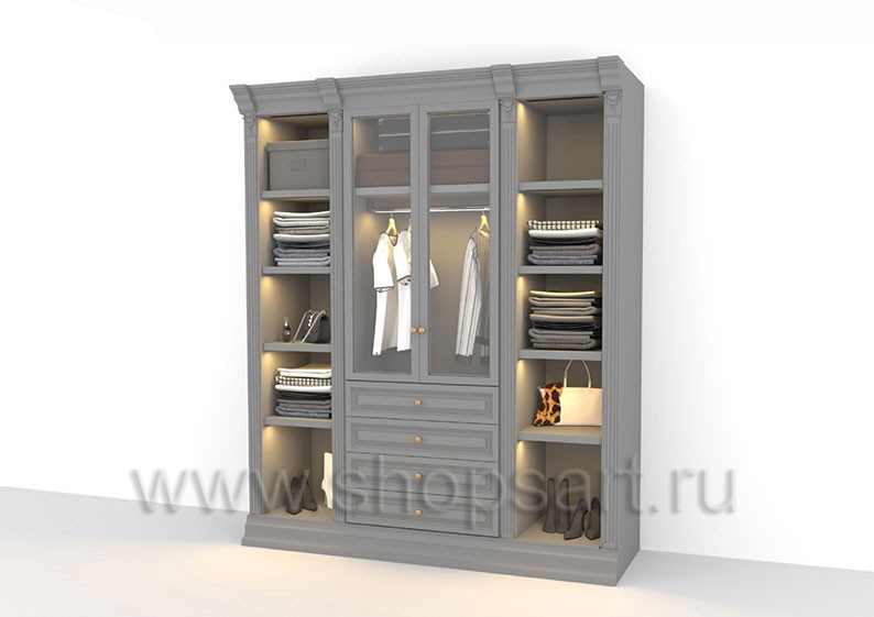 Шкаф для гардеробной комнаты состоит из трех секций. Центральный шкаф для одежды закрытого типа со стеклянными распашными дверками и выдвижными ящиками для хранения белья. Боковые шкафы оснащены прямыми полками и имеют открытую систему хранения. Конструкция изделия выполнена в классическом стиле. Каркас и полочки изготовлены из матового ЛДСП серого цвета. Декоративные элементы изготовлены из массива дуба.