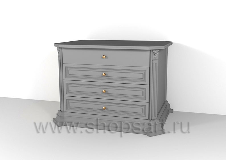Комод с выдвижными ящиками оформлен в классическом стиле, предназначен для хранения белья, аксессуаров, косметики или личных вещей. Каркас изделия выполнен из матового ЛДСП светло-серого цвета. Комод выполнен с декоративной отделкой: колонны и цоколь из массива дуба. Выдвижные ящики оснащены кареткой полного выдвижения. По желанию заказчика комод может быть выполнен в другом цвете материалов.