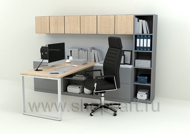 Комплект мебели «Концепт» подойдет для организации рабочей зоны в приемной офиса или кабинета руководителя. Благодаря угловой конструкции рабочего места, модель такой мебели не займет много места и позволит максимально использовать свободное пространство. Пристенный стеллаж имеет открытую и закрытую конструкцию с полочками для хранения документации и прочих вещей. По желанию заказчика комплект мебели может быть выполнен в другом цвете материалов.