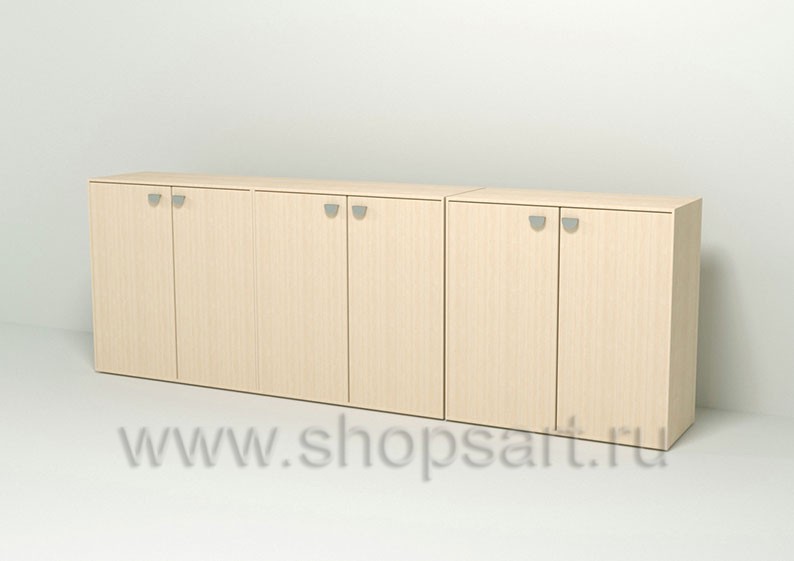 Комплект мебели для офиса состоит из трех пристенных, закрытых тумб с распашными дверками для хранения документов. Внутренне наполнение каждой тумбы имеет полки для хранения стандартных папок с документами. Комплект офисной мебели выполнен из матового ЛДСП. По желанию заказчика изделие может быть выполнено в другом цвете материалов и в других габаритных размерах.