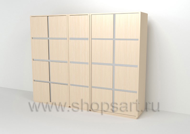 Комплект шкафов для одежды состоит из трех закрытых секций с раздвижными дверками, предназначен для персонала офиса или посетителей. Внутреннее наполнение изделия состоит из штанги для одежды и полочки для головных уборов. Комплект мебели выполнен из матового ЛДСП 16 мм. По пожеланию заказчика изделие может быть выполнено в другом цвете материалов и в другом размере.