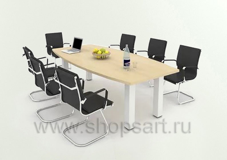 Стол для совещаний «Лорд» предназначен для оформления переговорных комнат или кабинета руководителя в офисных помещениях или других учреждений. Изделие рассчитано на восемь посадочных мест. Стол имеет стильный внешний вид, создан для комфортного размещения участников совещания или переговоров. Столешница имеет радиусную форму, выполнена из матового ЛДСП 25 мм., цвет «Клен натуральный», установлена на квадратные опоры белого, матового цвета.