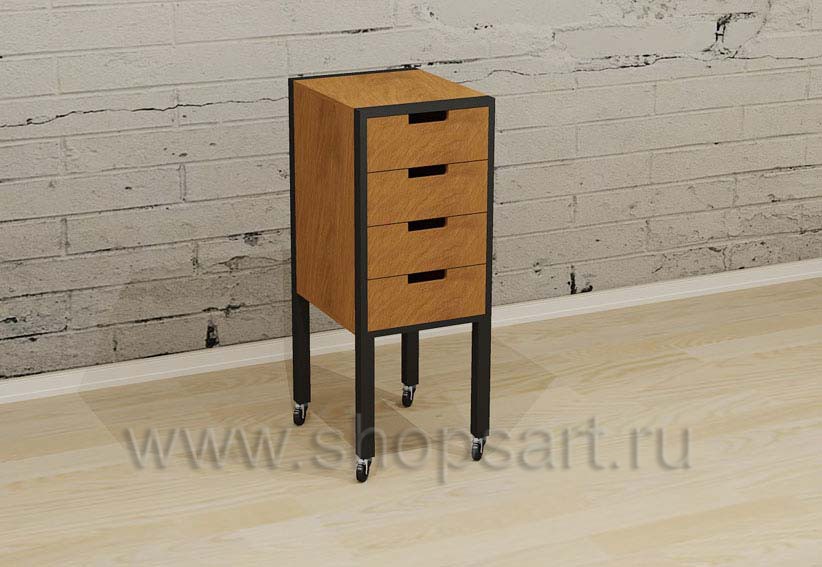 Мебель для барбершопа в виде тележки на металлическом каркасе и высоких ножках с колесиками. Тележка используется в салонах красоты оформленным в стиле Лофт, легко передвигается по залу, имеет 4 выдвижных ящика.