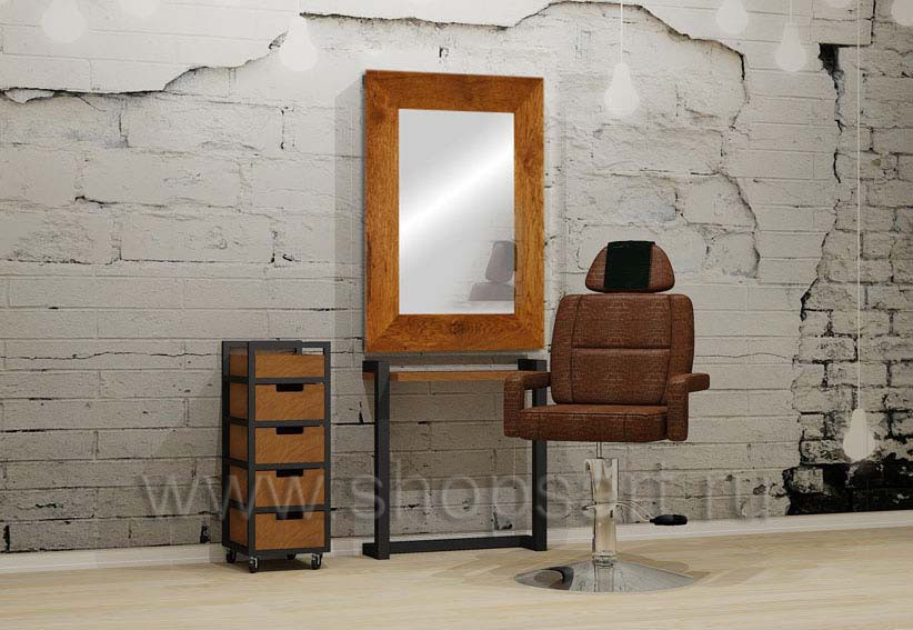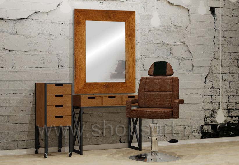Комплект мебели для барбершопа выполнен в стиле Лофт, из МАССИВА ДЕРЕВА или ЛДСП. Барбершоп-тумба на колесиках, имеет несколько выдвижных ящиков и удобна для перемещения. Столик под зеркалом служит не только в виде полки, но и имеет рабочие зоны в виде ящиков.