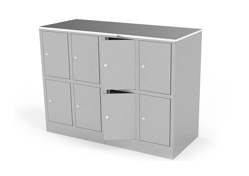 Сумочный шкаф со столешницей из нержавейки которую можно использовать в качестве рабочей поверхности для покупательских корзин или установки контрольных весов.