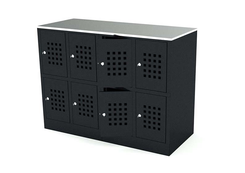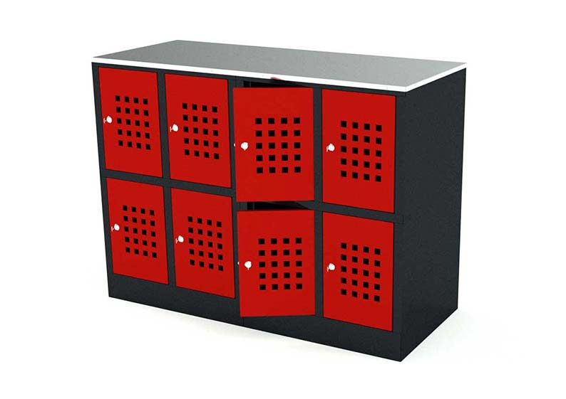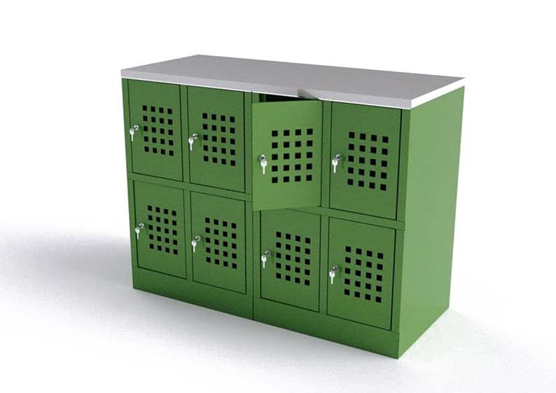 Металлический шкаф для хранения сумок имеет вертикальную долговечную сварную конструкцию. Выполнен из 8 отделов с перфорированными. По желанию заказчика может быть окрашен в любой цвет или комбинацию цветов по палитре RAL.