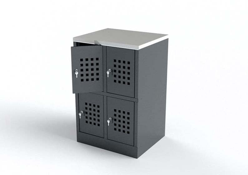 Металлический шкаф для сумок, сетчатой конструкции предназначен для хранения сумок и личных вещей покупателей в магазинах и супермаркетах. Конструкция содержит 4 ячейки и регулируемые ножки. Шкаф оснащен замками.
