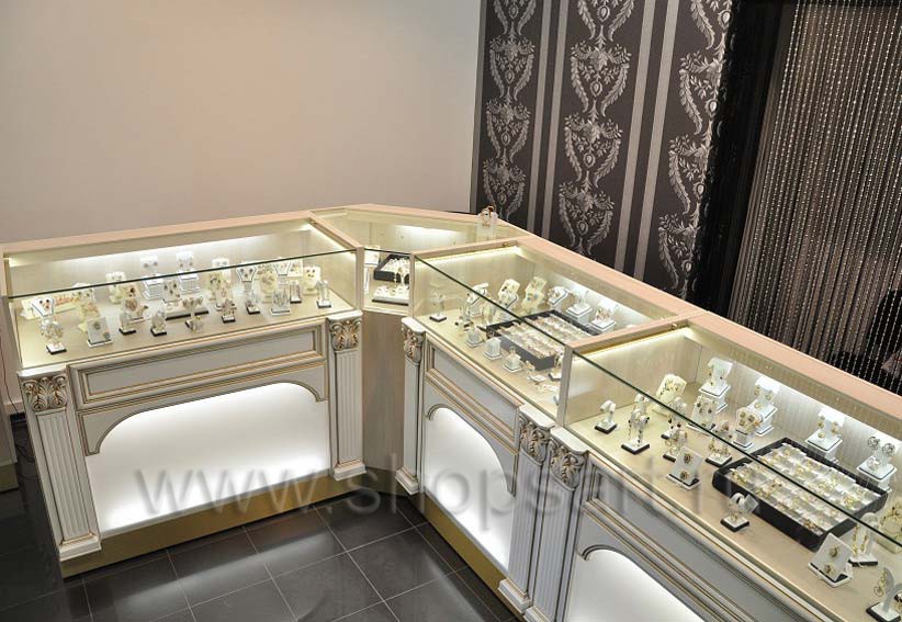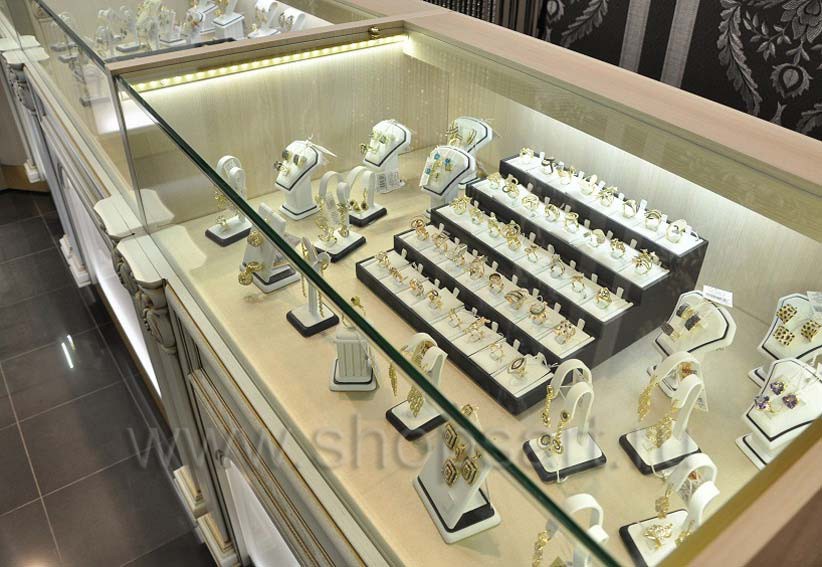 В каждом магазине присутствует оборудование из стекла. В ювелирных — мы делаем стеклянные колпаки и витрины. Колпаки склеиваются специальным клеем с использованием технологии УФ склейки. В магазинах обуви чаще используются стеклянные полки, которые пропускают свет, делая интерьер более легким. В магазин сувенирной продукции или подарков устанавливаются стеклянные витрины закрытого типа с распашными или раздвижными дверками. Стеклянные дверки позволяют защитить товар от падения или воровства, но в то же время позволяют рассмотреть его благодаря своей прозрачности.