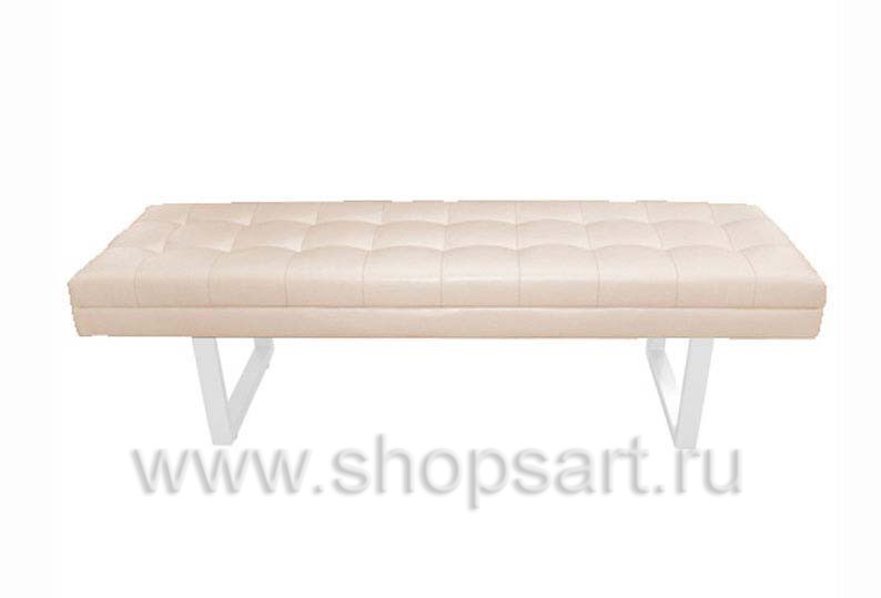 Банкетка бежевого цвета, стеганная на металлическом каркасе.