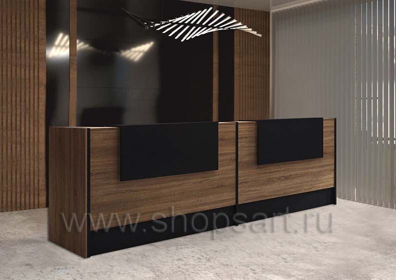 Ресепшн для администратора разработан для офисов, приемных администрации и прочих учреждений. Выполнен на два рабочих места. Изготавливается из матового древесного ЛДСП. Декоративные накладки и цоколь изготавливаются в черном, матовом цвете. Ресепшен может быть изготовлен в любой цветовой гамме.