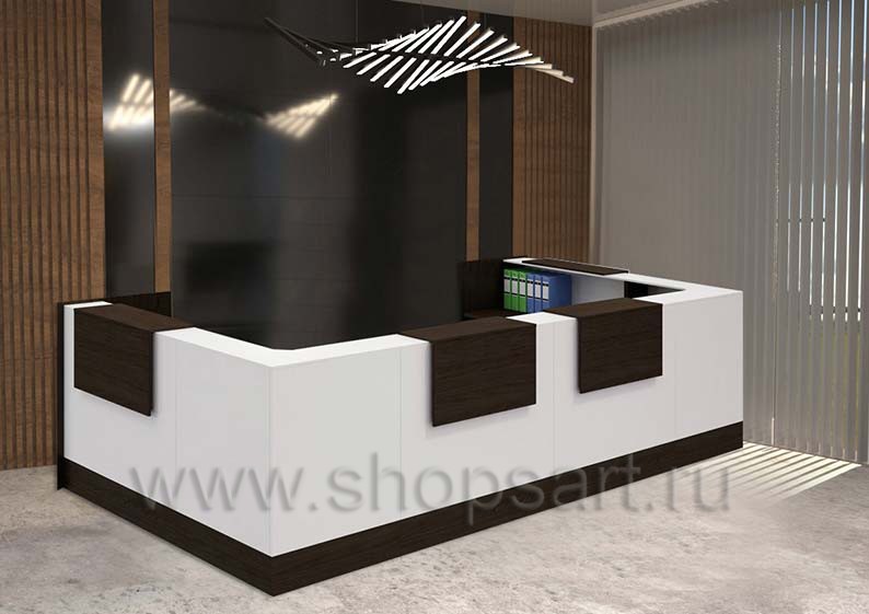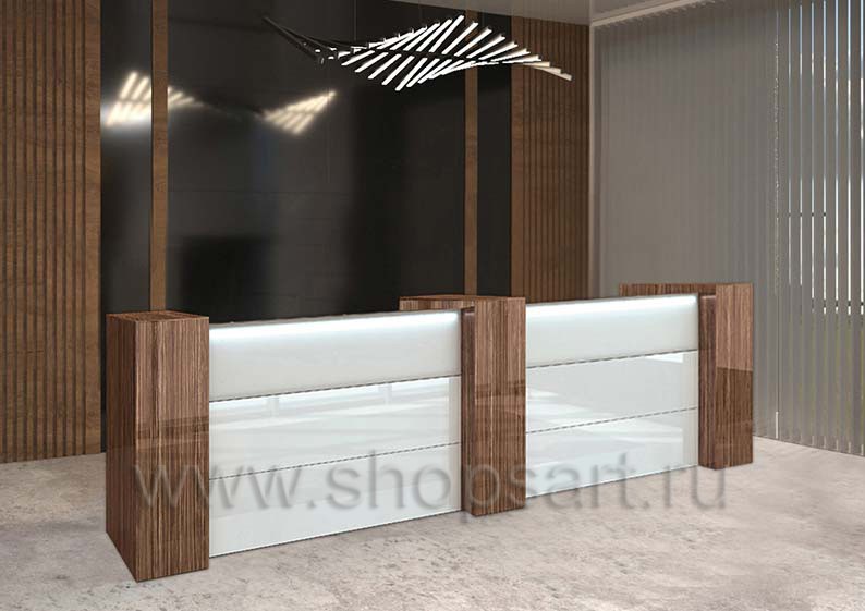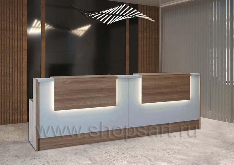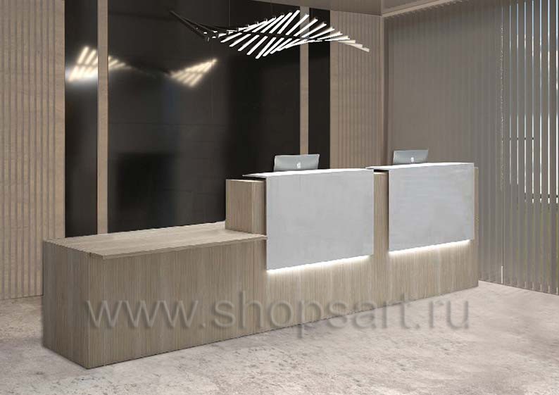 Стойка регистрации предназначена для оформления холлов деловых центров, медицинских центров, офисов, гостиниц. Служит рабочим местом для нескольких сотрудников. Фасадная часть стойки изготавливается из матового ЛДСП древесного цвета. По периметру декорируется массивной накладкой (полкой) из ЛДСП белого матового цвета. Материалы и габариты изменяются под нужды заказчика.