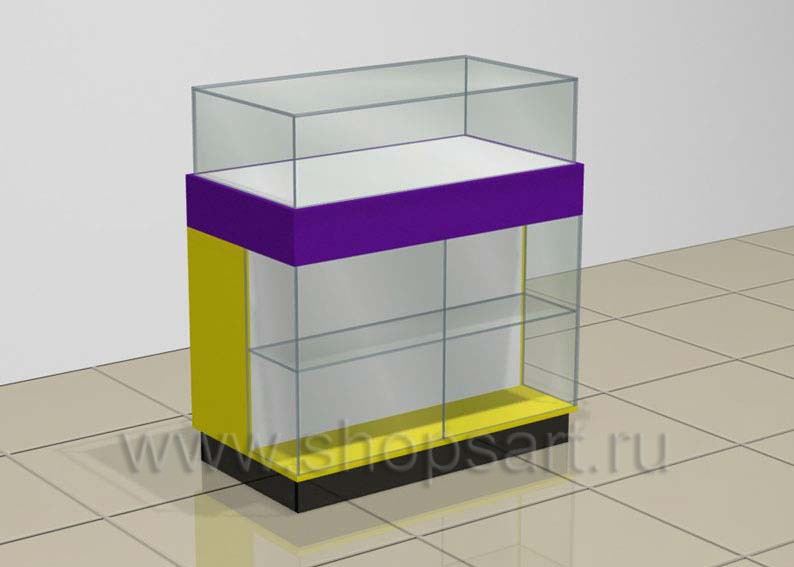 Прилавок изготовлен из комбинированных цветовых материалов. Верхняя часть прилавка выполнена в виде стеклянного колпака. Передняя часть выполнена в виде витрины со стеклянной полкой. С задней стороны прилавка имеются выдвижные ящики, которые служат накопителями для бижутерии или ювелирных украшений. Прилавок торговый может быть установлен как в линии прилавков, так и в центре зала. Прилавок витрина имеет максимальное поле для выкладки товара на разных уровнях. Все зоны закрываются на ключ.