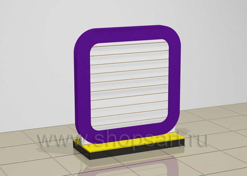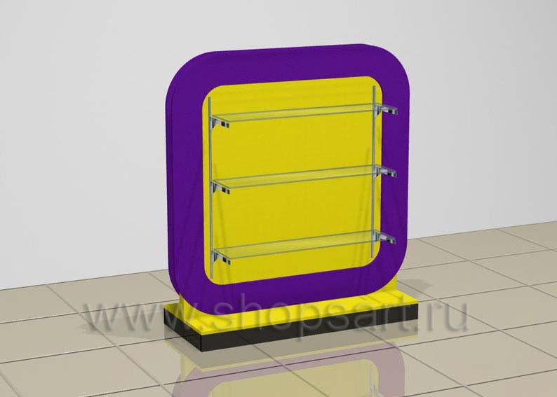 Торговая стойка предназначена для выкладки аксессуаров, клатчей и сумок. Островная стойка имеет форму овала, выполнена из ЛДСП разных цветов. С двух сторон монтируются перфорированные стойки, навешиваются полкодержатели, на которые устанавливаются полки из стекла 6-8мм. или из ЛДСП. Полки можно перемещать по высоте. Полки можно заменить навесным оборудованием — крючками и штангами и использовать для навески различного товара. Внизу торговой стойки расположен подиум. Цоколь подиумов можно изготовить из металлизированного пластика.