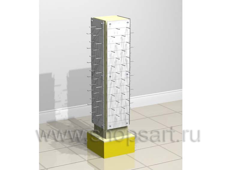 Торговая стойка предназначена для демонстрации бижутерии. Островная стойка имеет основание в виде колонны из ЛДСП к которой на дистанционных держателях, с четырех сторон, крепятся пластиковые панели из глянцевого молочного оргстекла с горизонтальной перфорацией. На панели устанавливаются прозрачные крючки из оргстекла для навески бижутерии. Внизу торговой стойки расположен подиум.