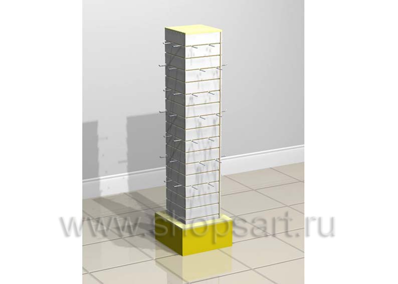 Торговая стойка предназначена для навески товара. Островная стойка имеет основание в виде колонны из ЛДСП и экономпанелей, расположенных с четырех сторон. Внизу торговой стойки расположен подиум. На экономпанель могут устанавливаться крючки или сферические чаши для мелкого товара. Цоколь подиумов можно изготовить из металлизированного пластика.