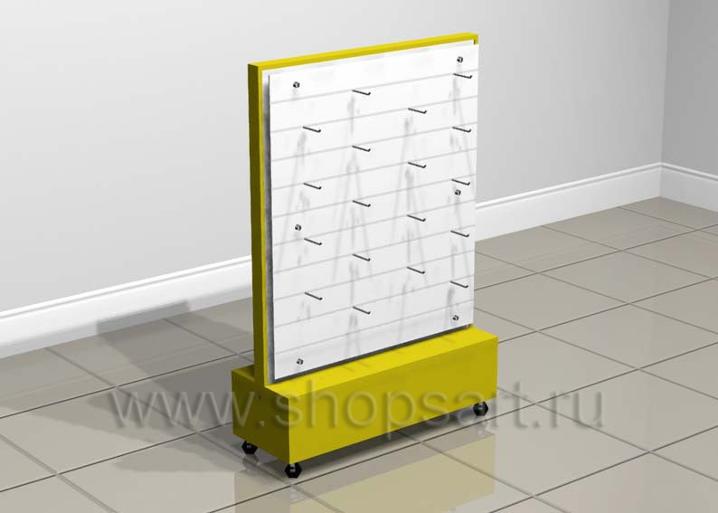 Торговая стойка предназначена для навески товара. Островная стойка имеет основание в виде колонны из ЛДСП и экономпанелей, расположенных с четырех сторон. Внизу торговой стойки расположен подиум. На экономпанель могут устанавливаться металлические крючки различной длины или сферические чаши для мелкого товара. Стойка изготавливается на колесиках для удобства перемещения.