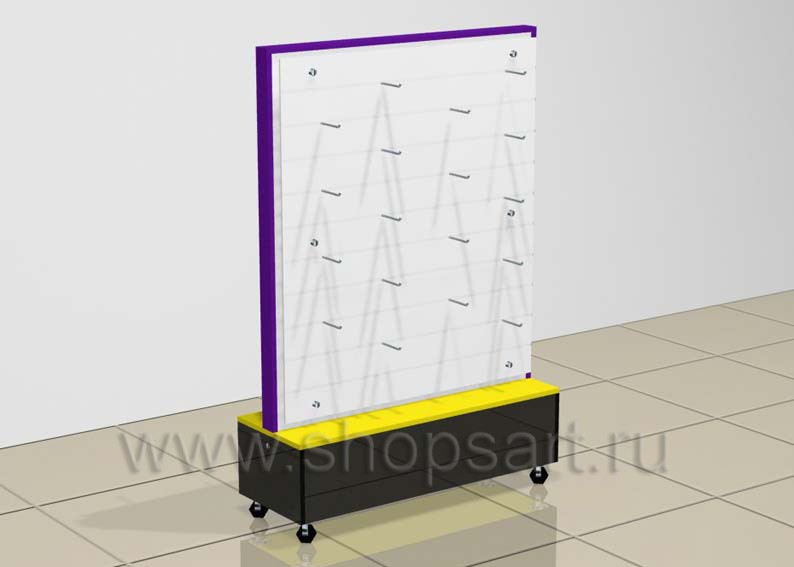 Островная стойка имеет основание из ЛДСП, к которому на дистанционных держателях крепятся пластиковые панели. На панели устанавливаются крючки для навески бижутерии. Нижняя часть стойки содержит накопитель с распашными дверками или выдвижными ящиками. Стойка изготавливается на колесиках для удобства перемещения.