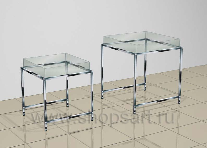 Торговые демонстрационные столики производятся из стекла 8мм. и металлической хромированной трубы 25х25мм. Сверху столиков устанавливается стеклянный колпак для выкладки товара. Благодаря оригинальному дизайну, гармонично сочетающему хромированный металл и стекло, остров привлекает внимание покупателей. Островная конструкция удобна для выкладки и просмотра товара. Используется для выкладки товара в центре зала и оформления витрин.