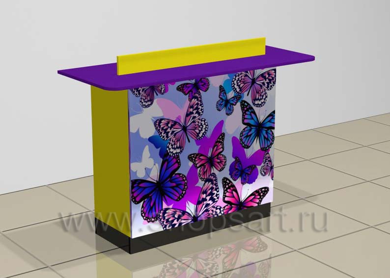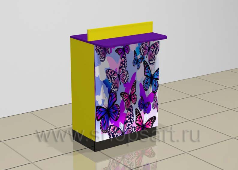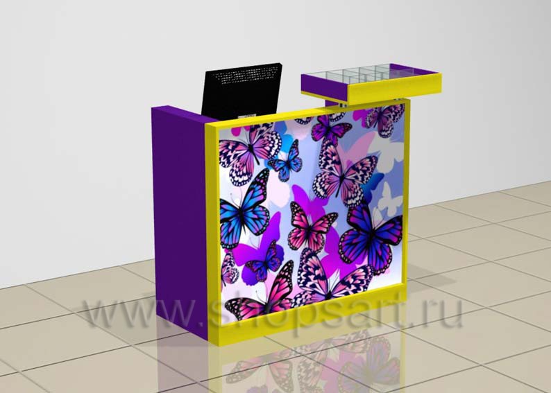 Кассовый стол изготовлен из комбинированных цветовых материалов. На фасад нанесен декоративный постер. По желанию Заказчика фасад кассового стола может содержать логотип и название магазина. Кассовый узел может иметь любое внутреннее наполнение: полки, дверки и шкафчики с ящиками на направляющих полного выдвижения. На верхнюю столешницу устанавливаются полеты для мелких изделий: колечек, заколок, серёжек.