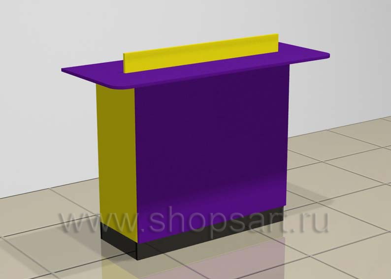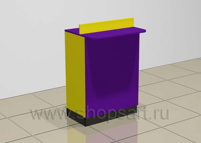 Кассовый стол изготовлен из комбинированных цветовых материалов, фасад выполнен в сиреневом цвете. Кассовый узел может иметь любое внутреннее наполнение: полки, дверки и шкафчики с ящиками на направляющих полного выдвижения. На верхнюю столешницу устанавливаются полеты для мелких изделий: колечек, заколок, серёжек. Благодаря своим небольшим габаритам идеально подходит для торговых помещений малой площади.