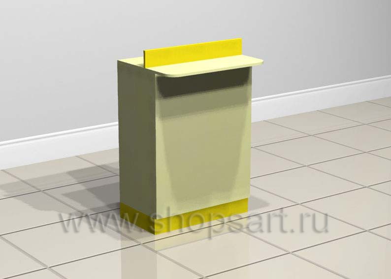 Кассовый стол изготовлен из комбинированных цветовых материалов. Внутренняя часть кассового стола содержит полки. По желанию Заказчика полки могут быть заменены на ящики. Кассовый узел может быть укомплектован дверками. Благодаря своим небольшим габаритам идеально подходит для торговых помещений малой площади.