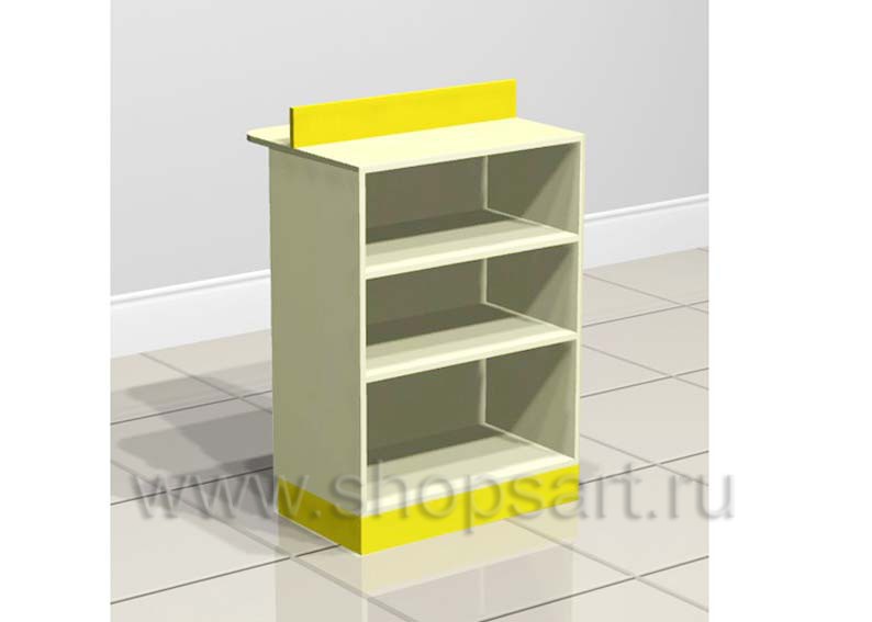 Островная стойка имеет основание из ЛДСП и экономпанелей, расположенных с двух сторон. Торговая стойка может комплектоваться полками из ЛДСП, крашеного МДФ, стекла различной глубины. Стойки могут оснащаться любыми кронштейнами шириной 600мм., 900мм., 1200мм. и аксессуарами для навески и выкладки. Цоколь подиумов можно изготовить из металлизированного пластика.
