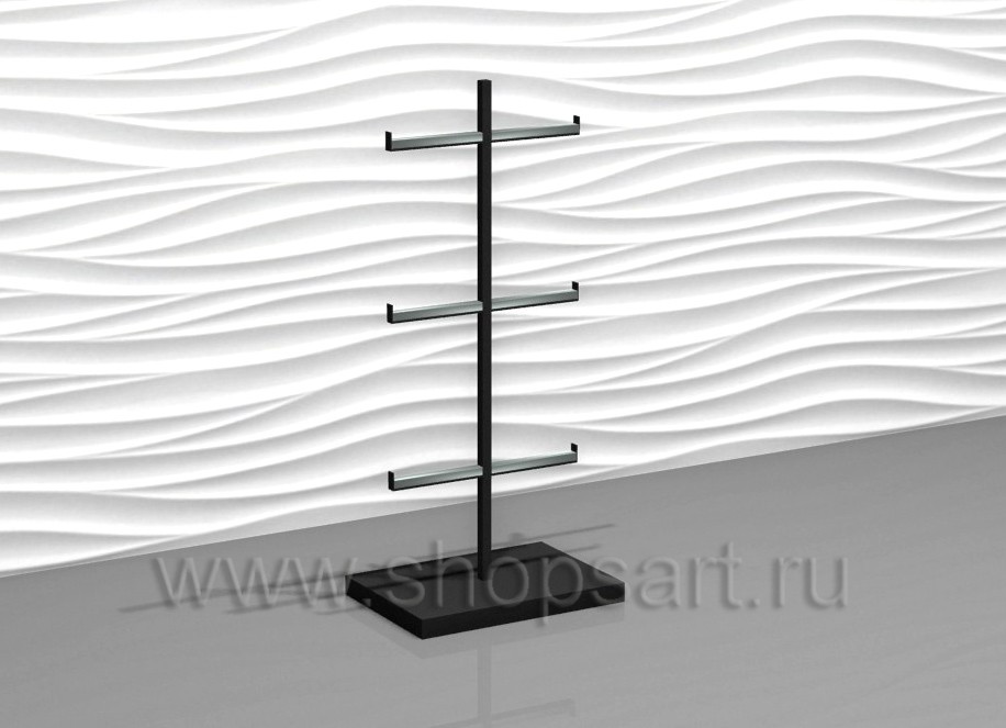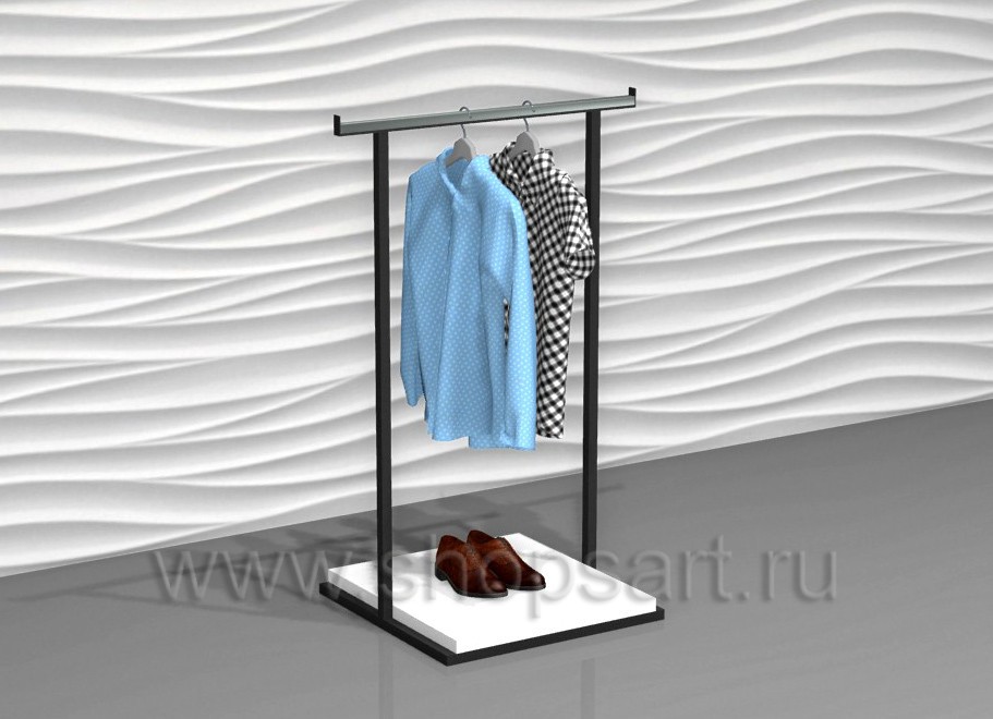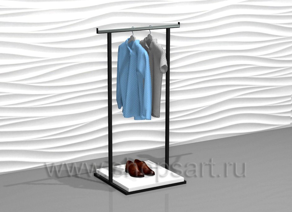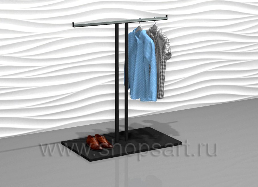 Островная стойка используется для вывески одежды и выкладки на подиум сопутствующих товаров. Благодаря увеличенной высоте стойки, на ней можно вывешивать удлиненные модели одежды. Внизу стойки устанавливается белого цвета подиум из высокоглянцевого МДФ или ЛДСП. Торговая стойка имеет в своей основе металлическую сварную квадратную трубу 25х25мм. с покрытием порошковой краской чёрного, матового цвета.Подробнее