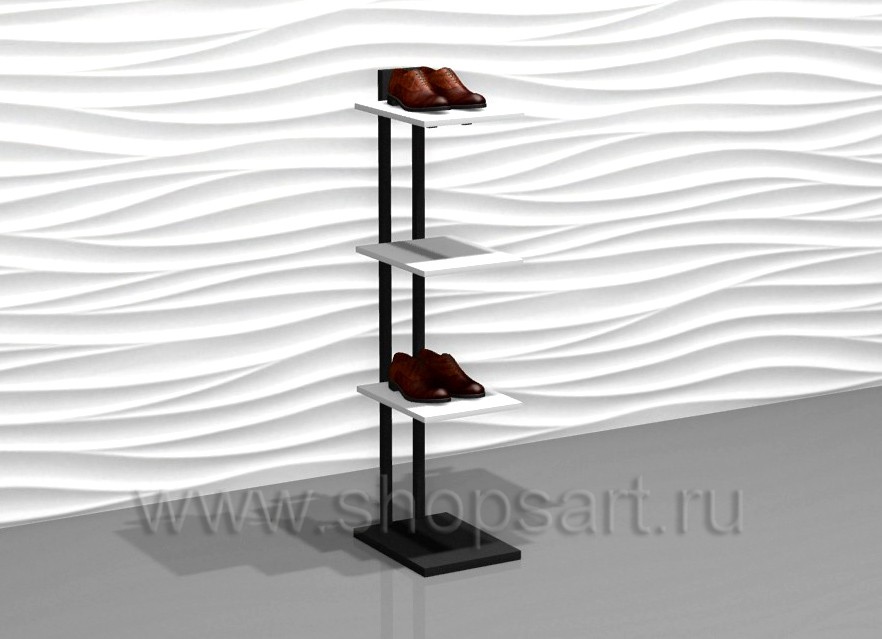Пристенный торговый стеллаж с полками используется для выкладки одежды, обуви, сумок, аксессуаров и др. Стеллаж пристенный оснащен четырьмя полками, одной полкой-подиумом и одной стеклянной полкой. Благодаря открытой конструкции, стеллаж удобен для выкладки и просмотра товара. Торговый стеллаж имеет в своей основе металлическую сварную квадратную трубу 25х25мм. с покрытием порошковой краской чёрного, матового цвета.Подробнее
